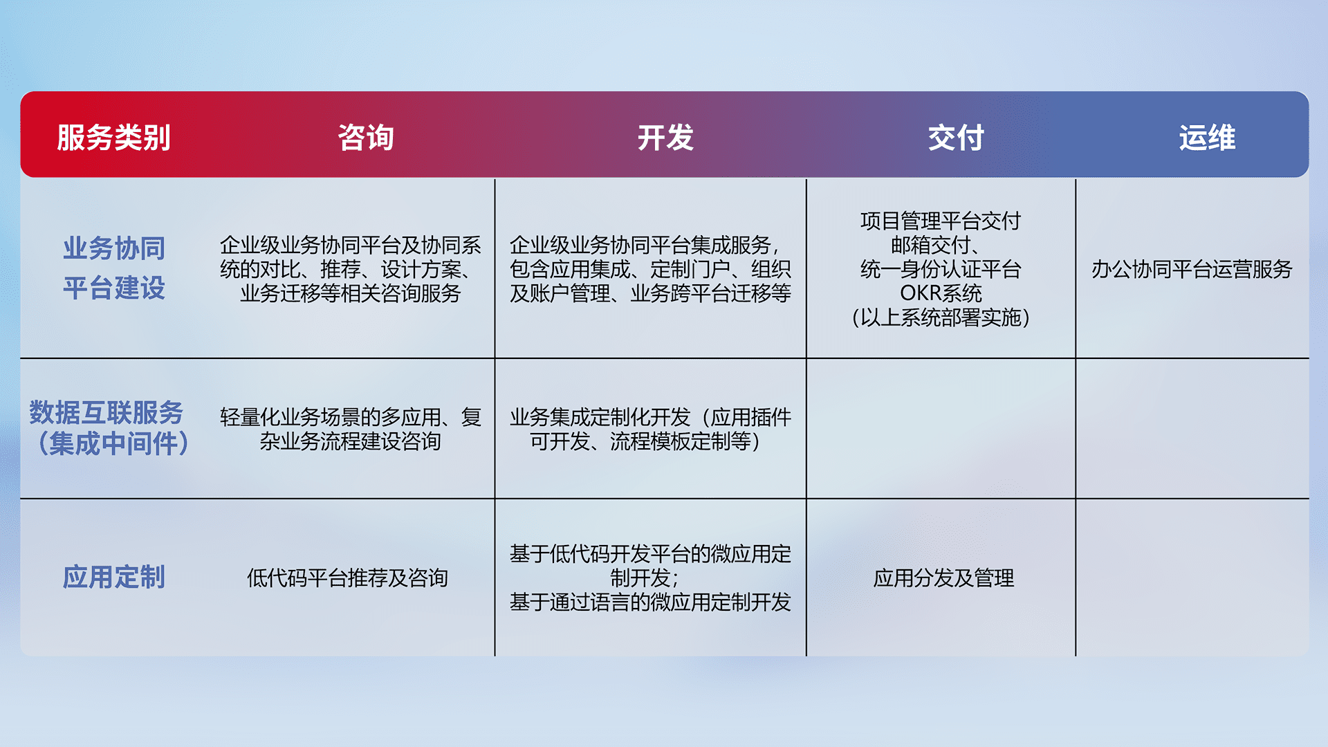针对钉钉、、企微、、、、IDaas等平台级产品提供产品的规划、、方案、、、交付、、、定制化开发等服务,,,,实现如统一协同办公、、智能客户服务、、、混合会议管理、、、、智能数据查询、、等业务场景,,,实现数字化转型。。。。