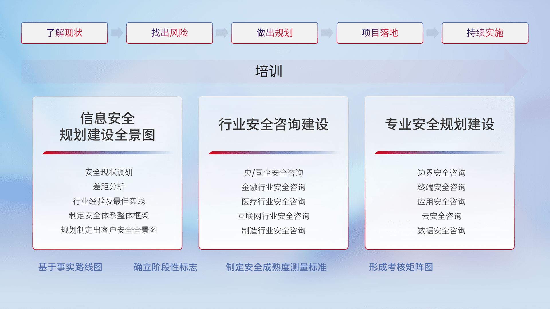 针对客户行业特性,,,,以专业的安全服务+多厂商联合解决方案提供专属的一站式安全管理服务,,,,帮助客户全面感知网络空间威胁,,基于识别、、、检测、、分析、、、防护、、、监测、、、、响应的服务理论模型,,,,从方案咨询、、、集成交付、、、、评估验证、、、、优化加固、、、、运维运营,,,致力于为客户提供完整的闭环管理式安全服务。。以实战经验为客户打造高抵御风险的安全体系,,帮助客户发现威胁、、、对抗威胁、、处置威胁,,不断积累安全对抗能力,,,,持续保障数字化安全。。
